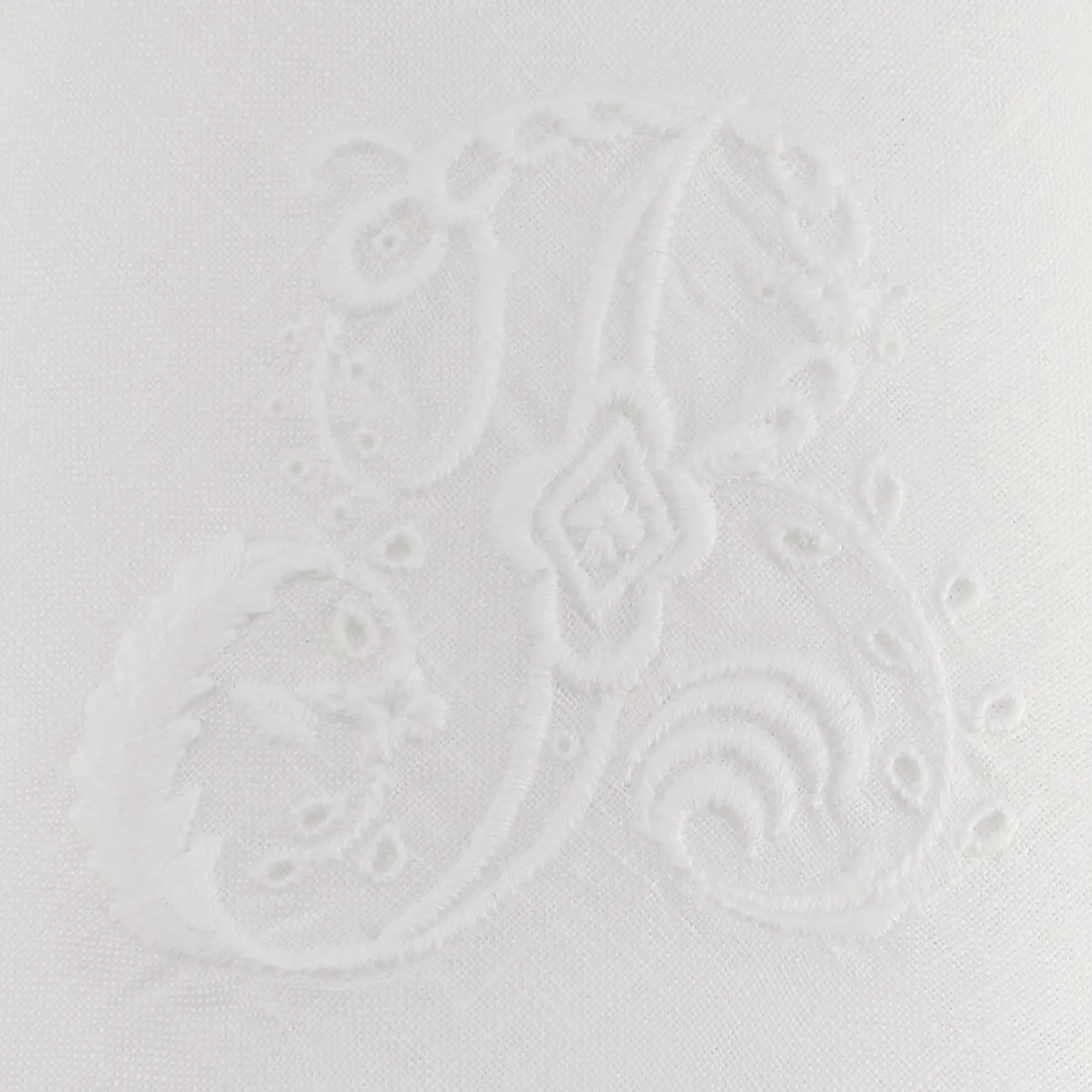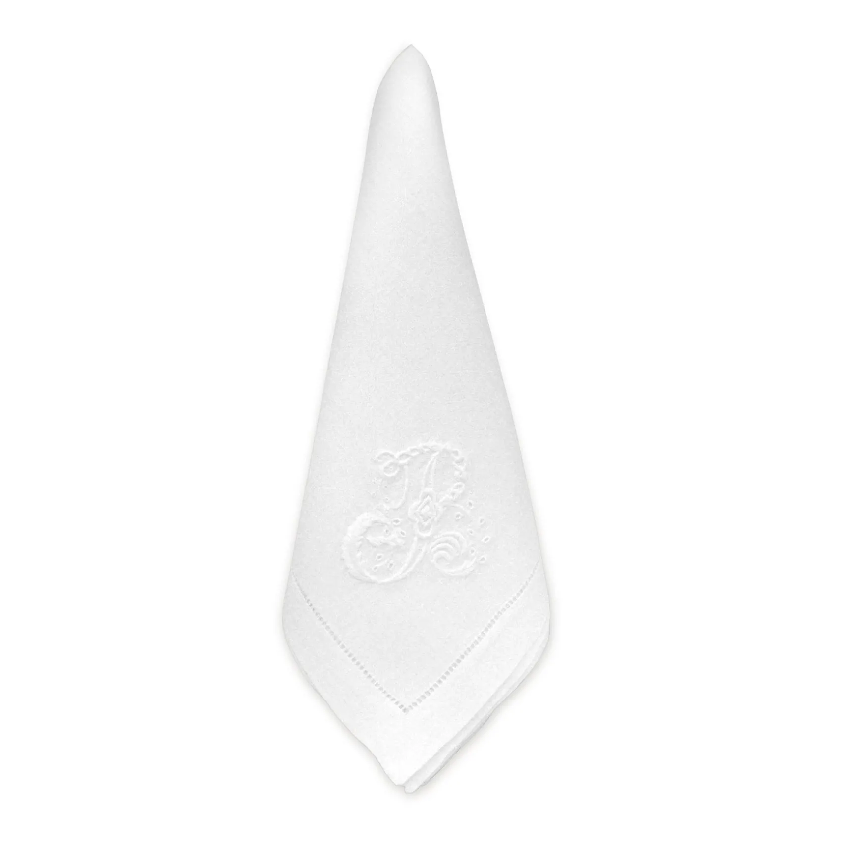 These white monogram initial dinner napkins bring the perfect personal touch to your dinner table. The letter ‘B’ is ornately embroidered with a cutwork technique and white thread. Beautiful for everyday use & birthday celebrations!