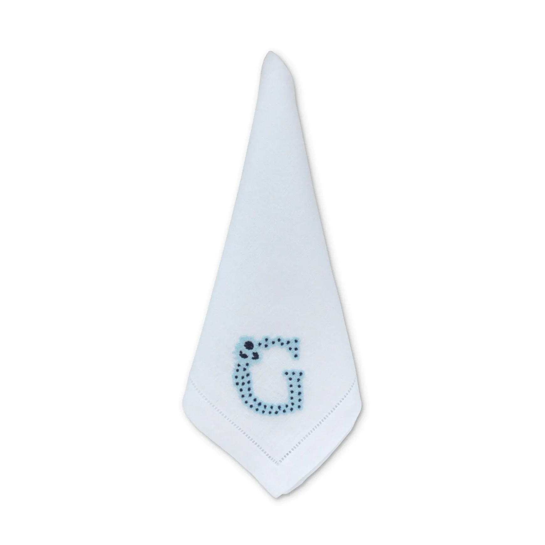 These “G” initial dinner napkins bring the perfect personal touch to your dinner table. The letter is ornately embroidered with a blue floral G with navy and teal thread. Beautiful for everyday use, springtime, & birthday celebrations.