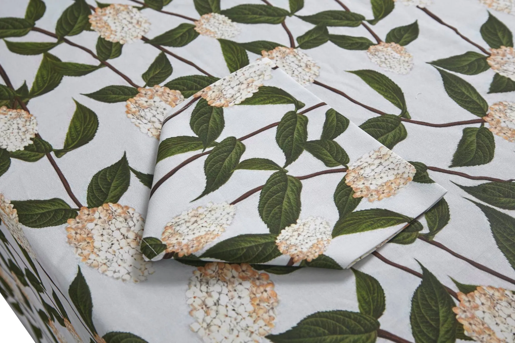 Beautiful hydrangea printed tablecloth with a pale blue background.
