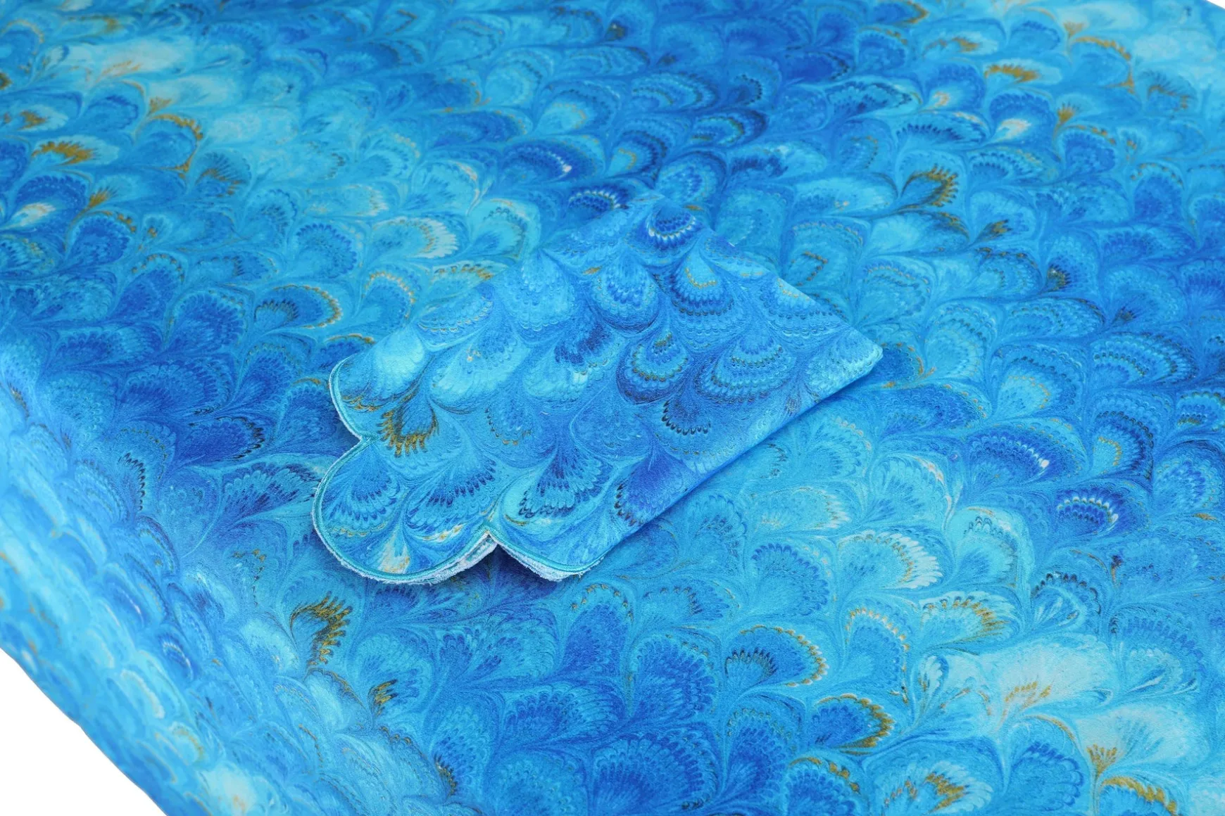 This blue marble-patterned, rectangular tablecloth is 5 feet X 13.25 feet.