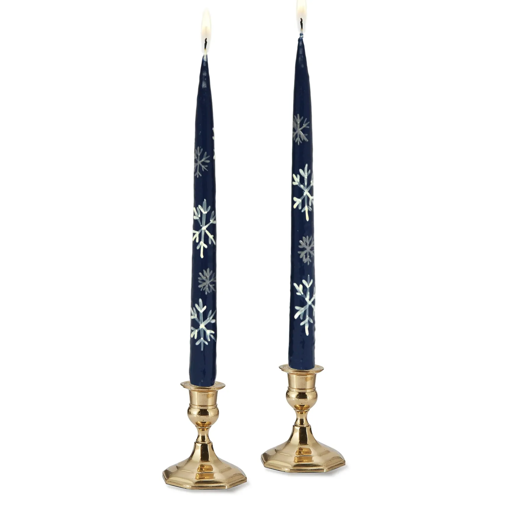 This set of 2 unscented taper candles is painted by hand. The motif is white painted snowflakes.