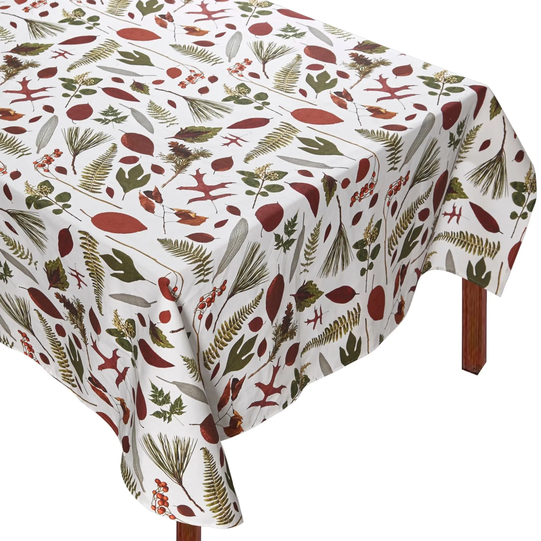 The motif of this tablecloth is pressed fall leaves on a white background.