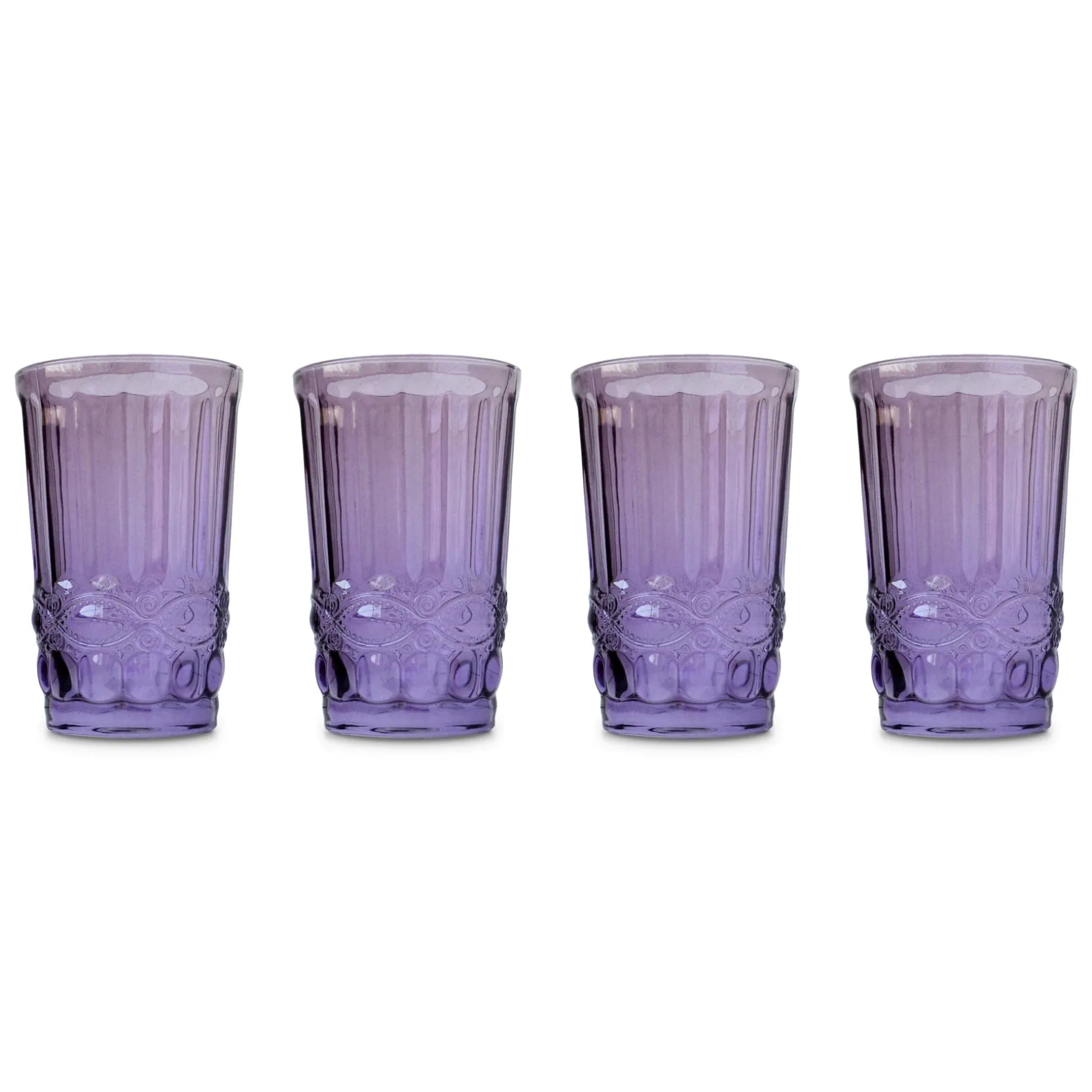 This set of 4 purple drinking glasses is pressed with a decorative floral motif.