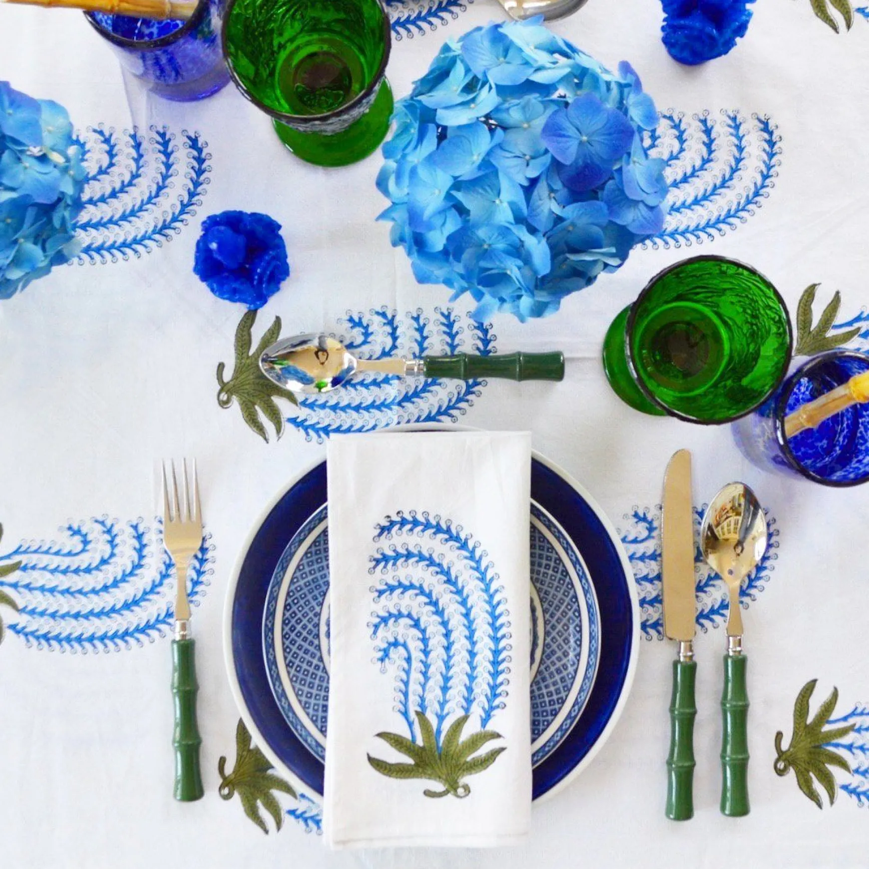 This set of 4 blue buteh block-printed napkins are 20 inches x 20 inches.