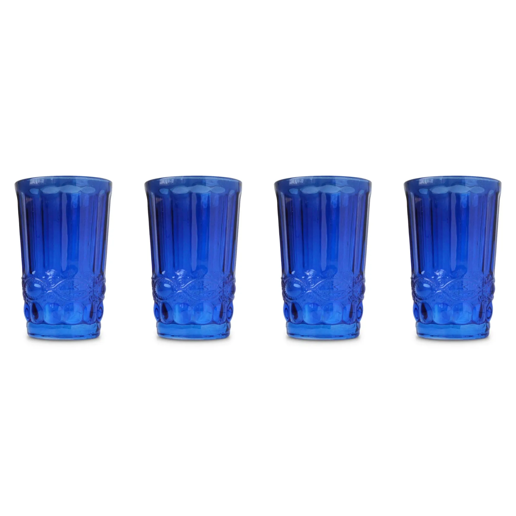 This set of 4 drinking glasses is pressed with a decorative floral motif.