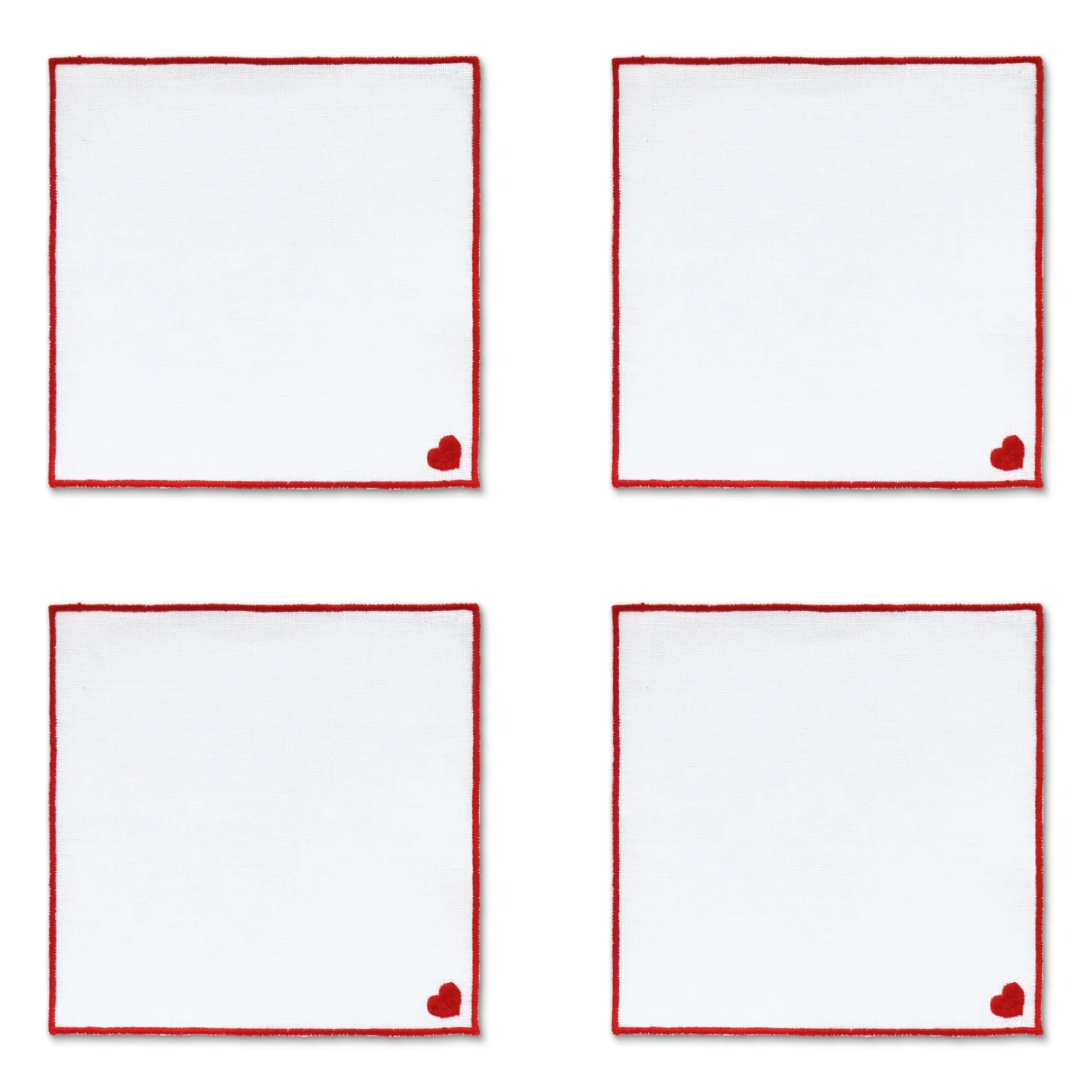 Classics are always in style. These white linen square cocktail napkins feature a clean red trim and bitty heart.