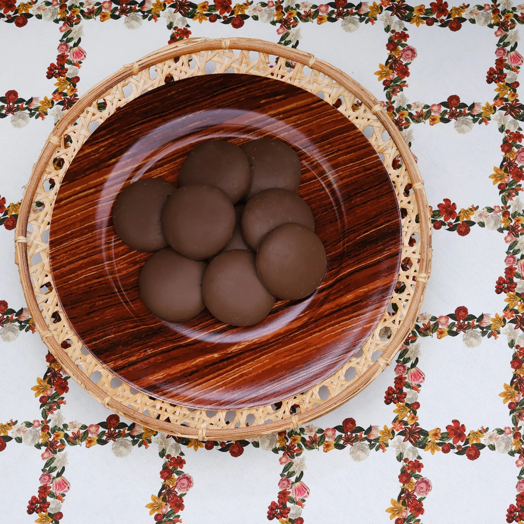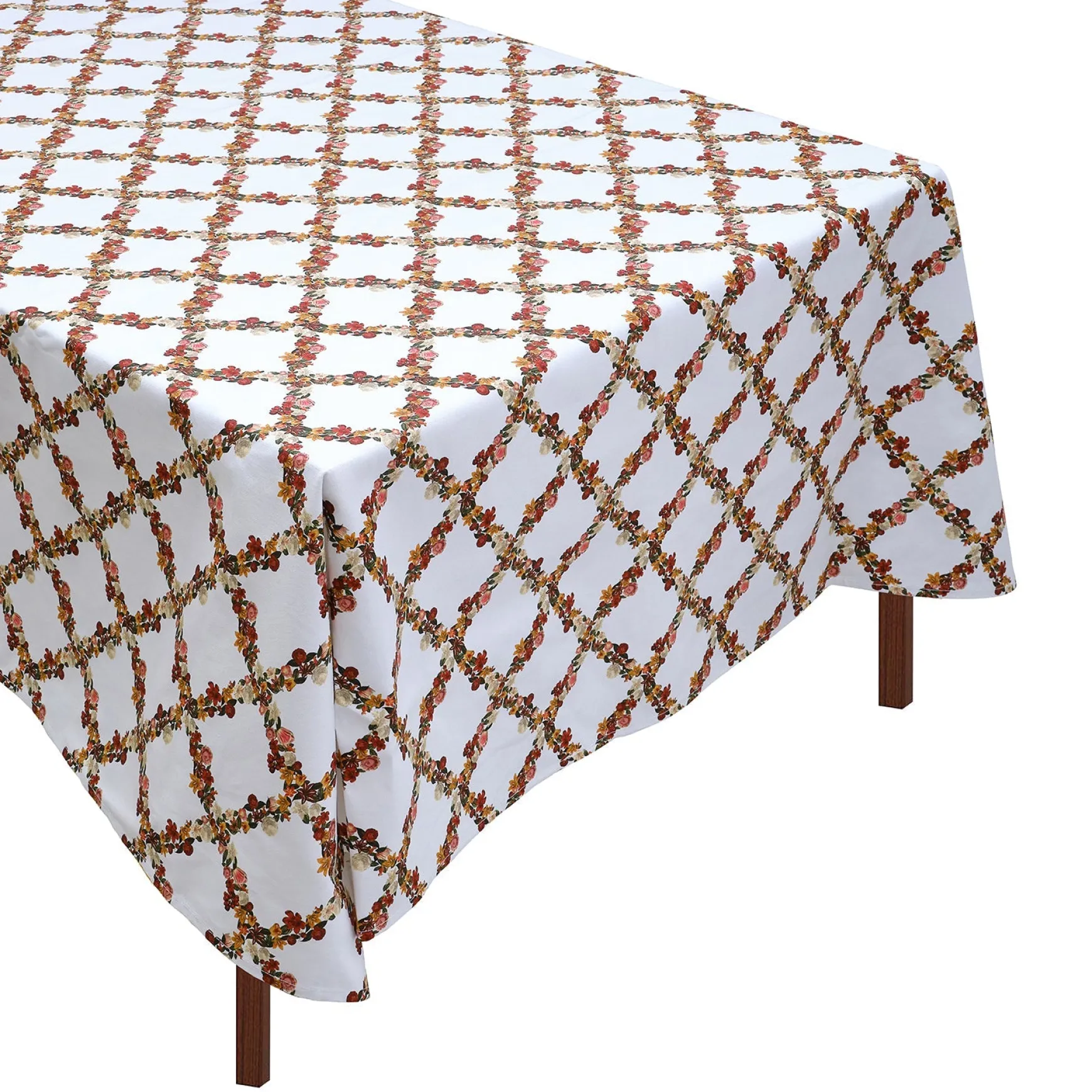 Inspired by vintage fabric, this warm colored pattern features an array of red, orange, and white flowers and is a festive covering for Thanksgiving, Christmas, and other cooler weather parties.