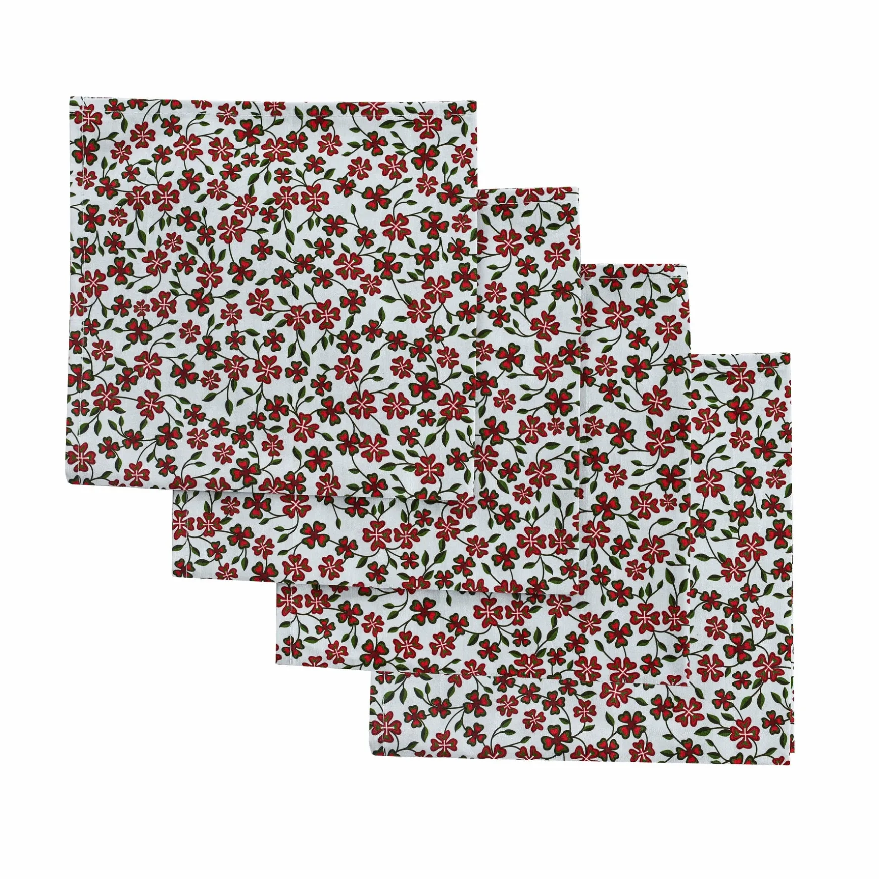A printed cotton napkin set with a meadow of four leafed clovers in festive colors.