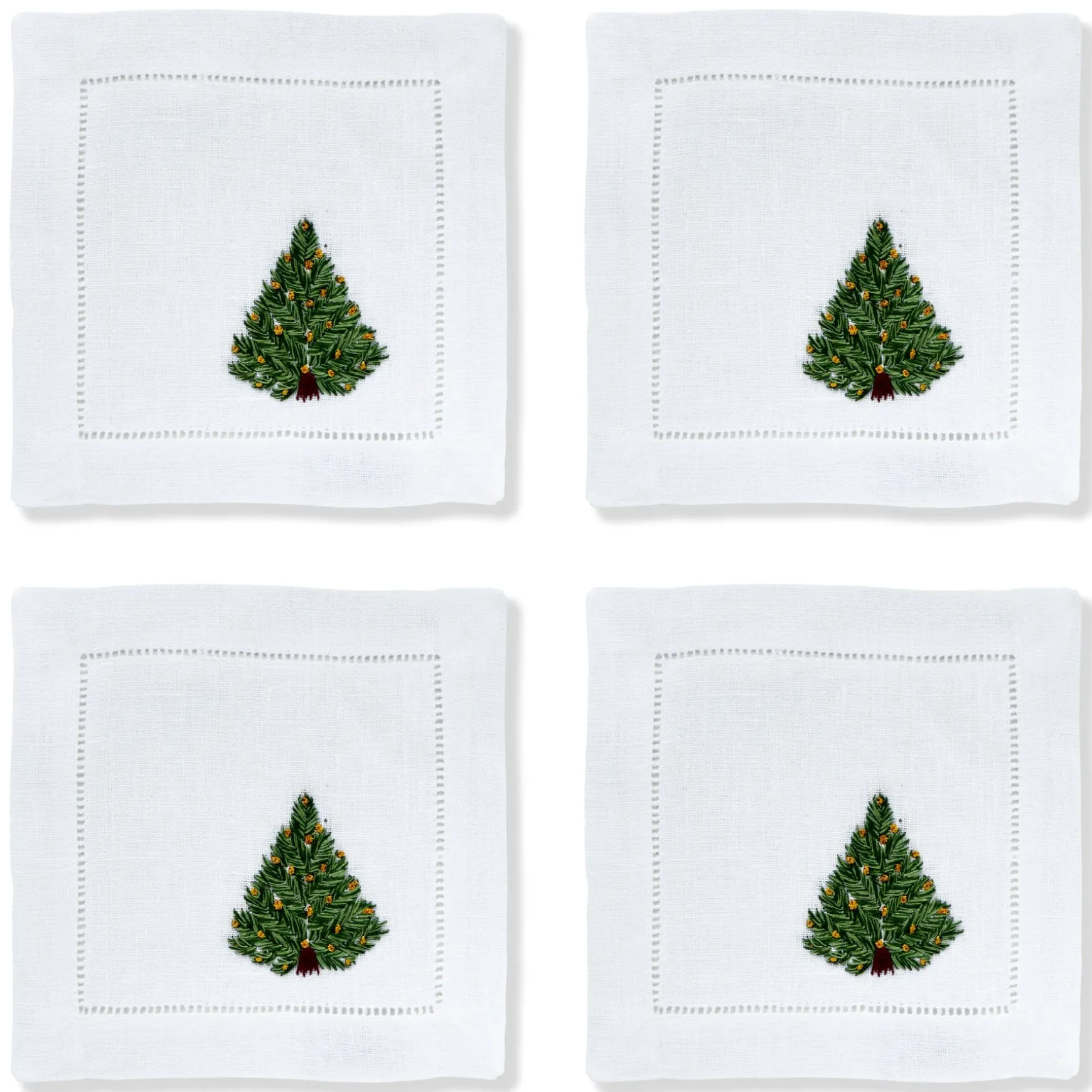 A perfect embroidered Christmas tree cocktail napkin as you celebrate the holidays. Little gold stitches represent ornaments.