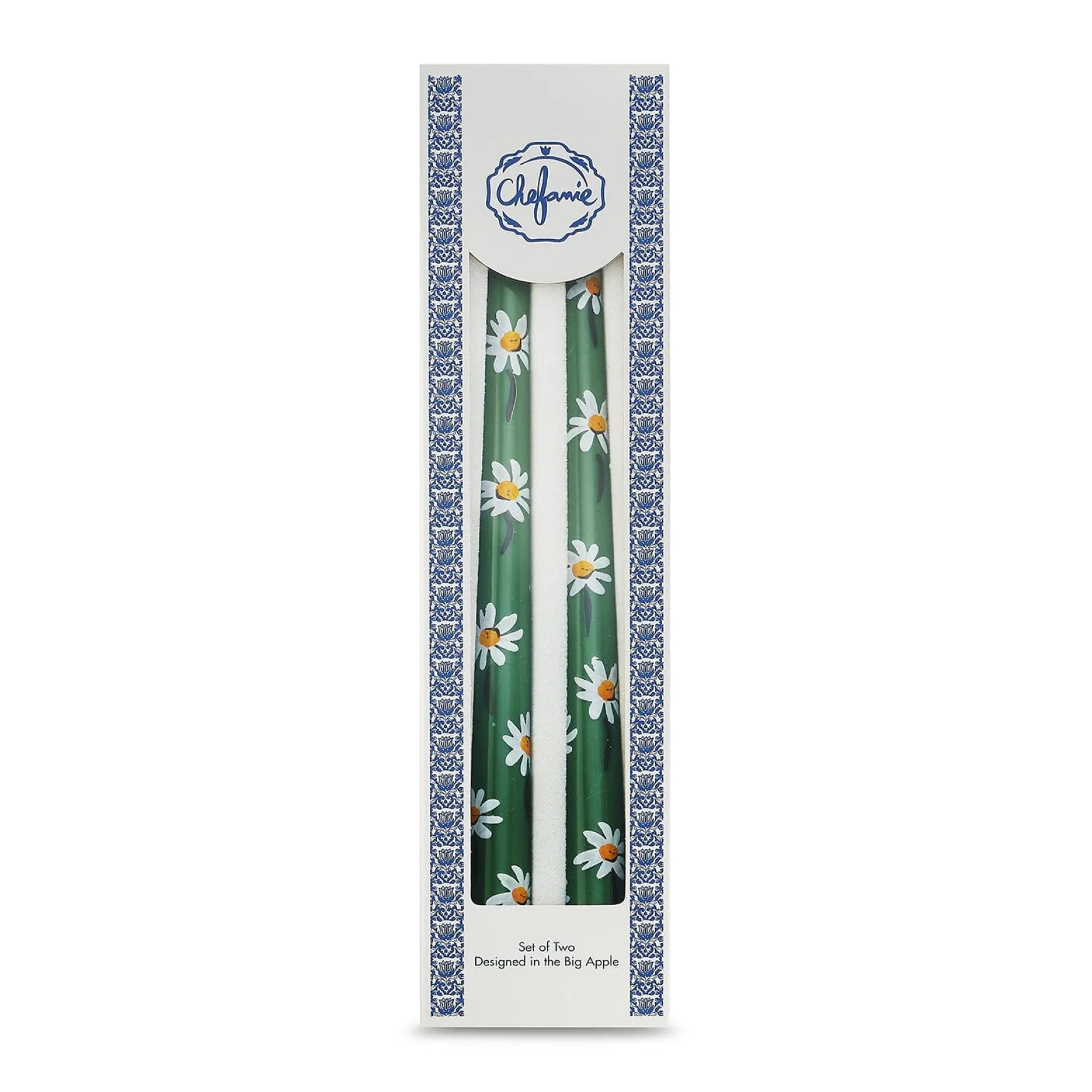This set of 2 unscented taper candles is painted by hand. The motif is delicate daisies on a green background. Perfect to match your Y2K style.