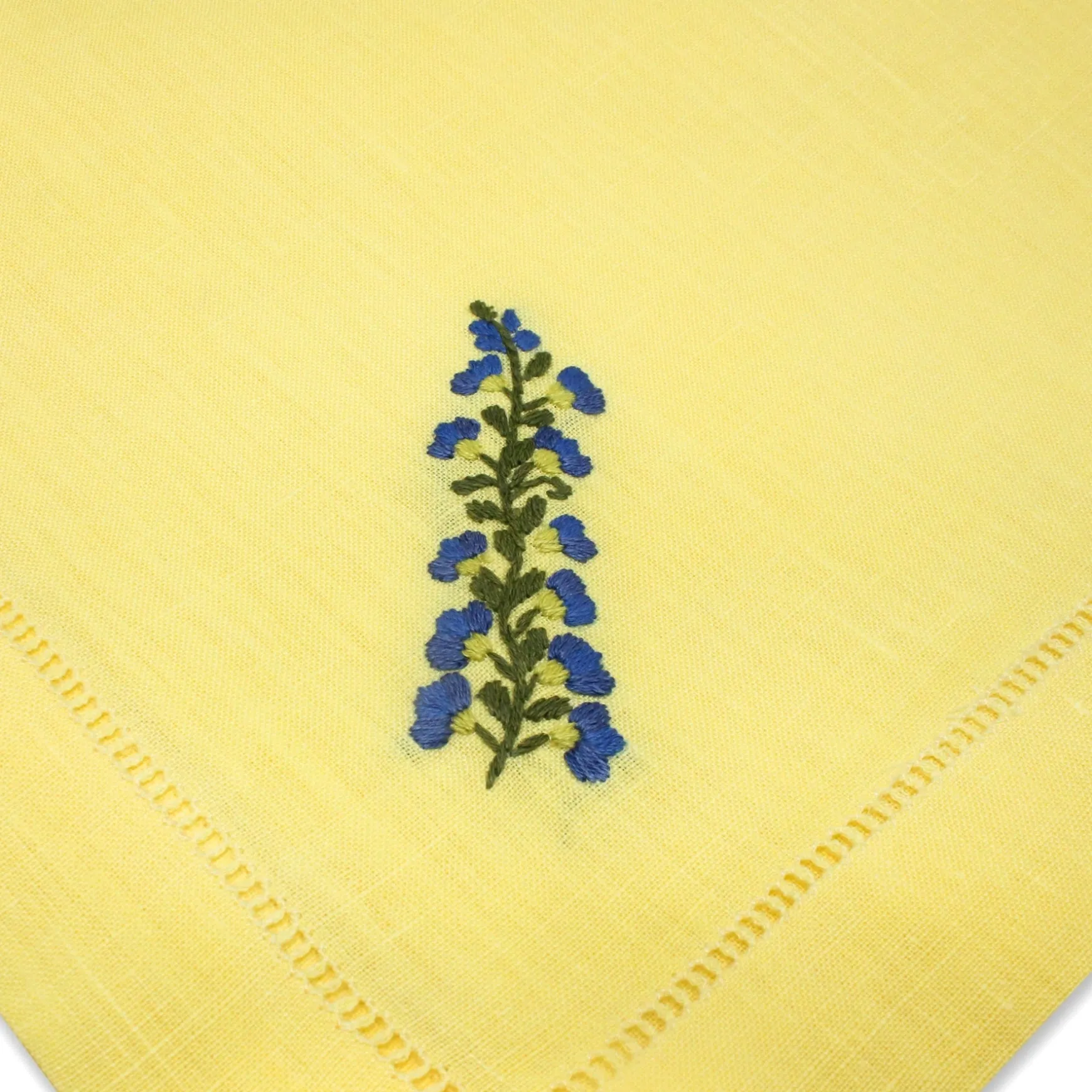 Purply delphiniums adorn these yellow linen dinner napkins. Lovely for Easter, a springtime dinner party, or a happy breakfast in the garden.