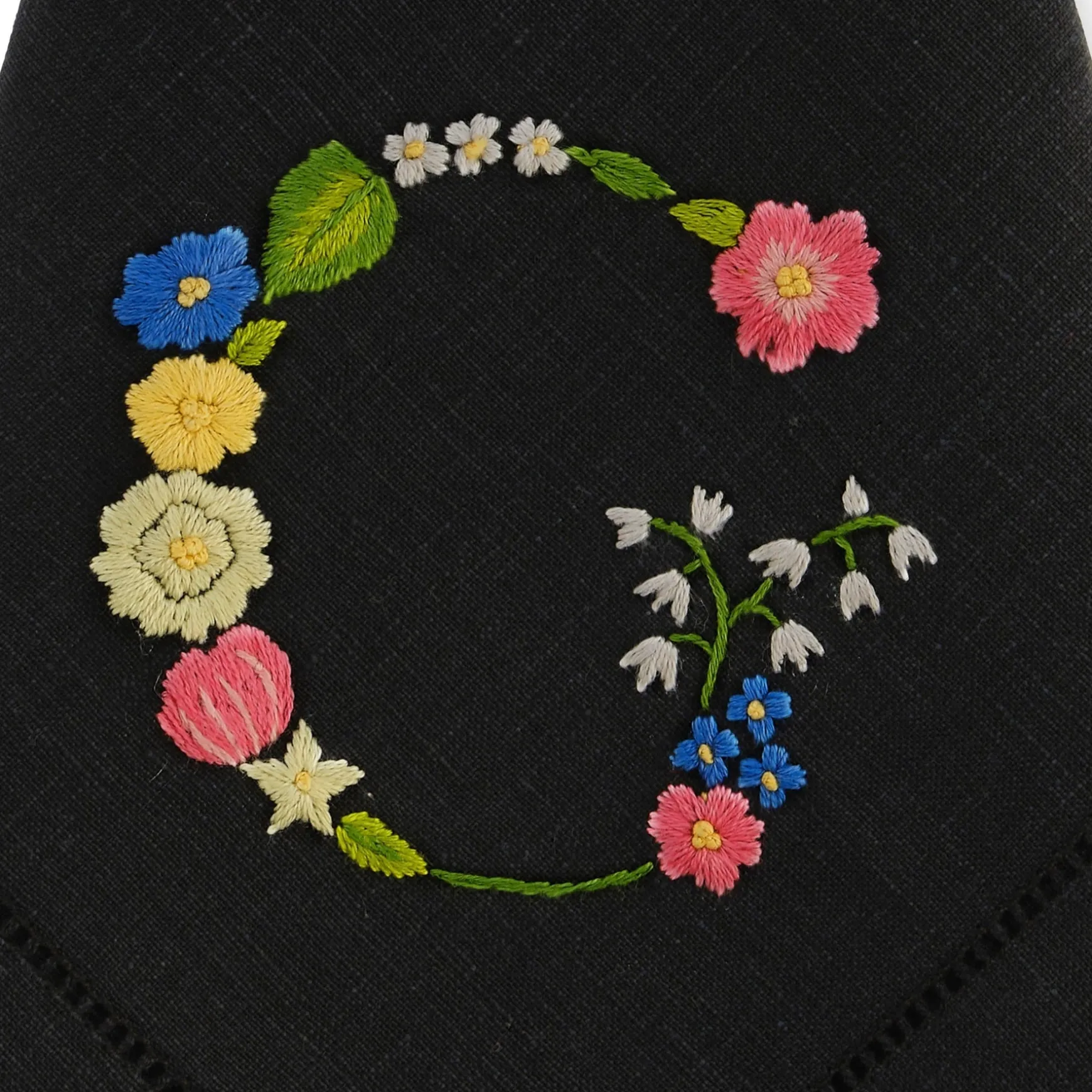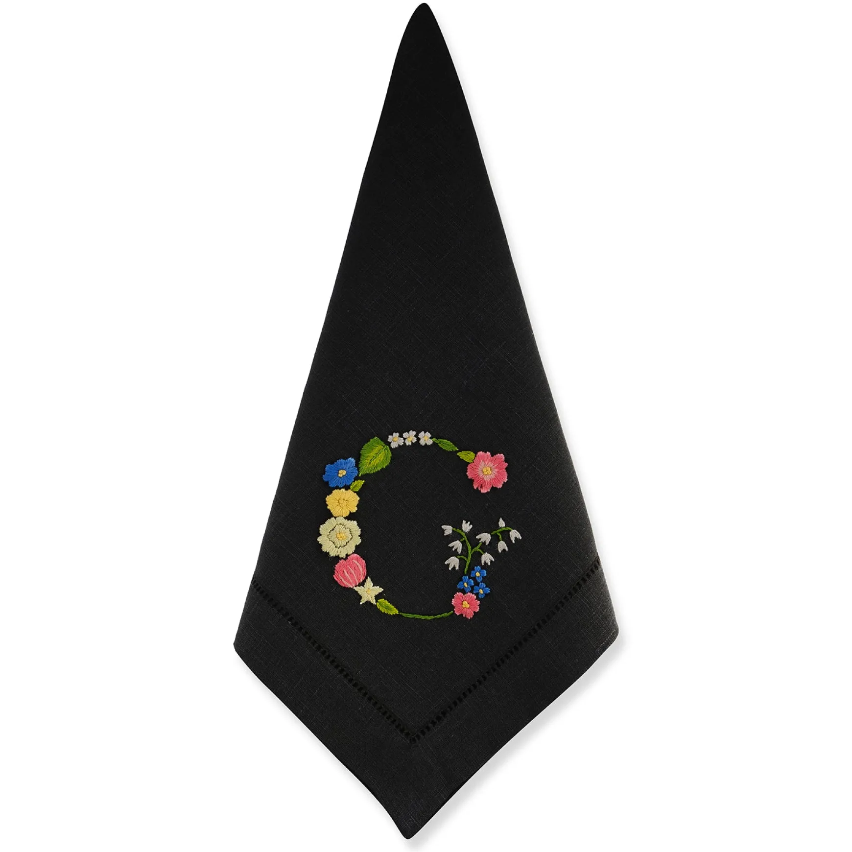These “G” initial dinner napkins bring the perfect personal touch to your dinner table. The letter is ornately embroidered with colorful florals inspired by Tiffany’s Sybil Connolly plates. Beautiful for everyday use, springtime, & birthday celebrations.