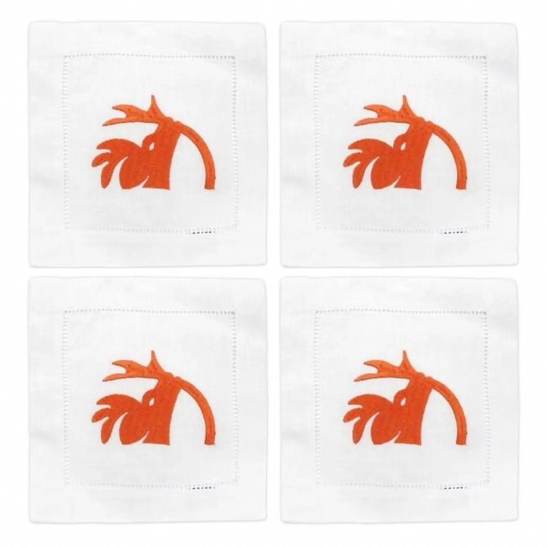 Embroidery on linen napkins. Each napkin’s dimensions are approximately 6 inches x 6 inches.
