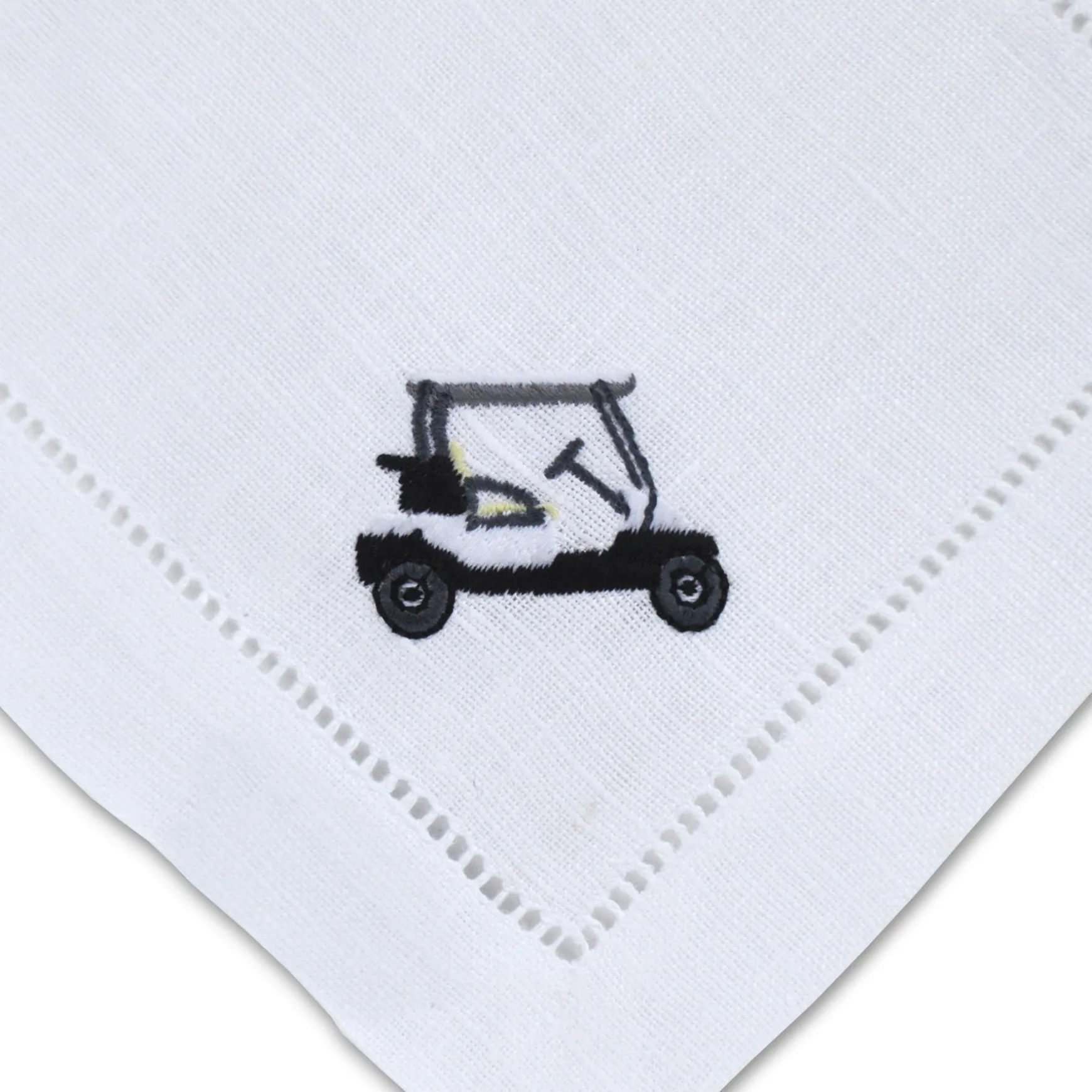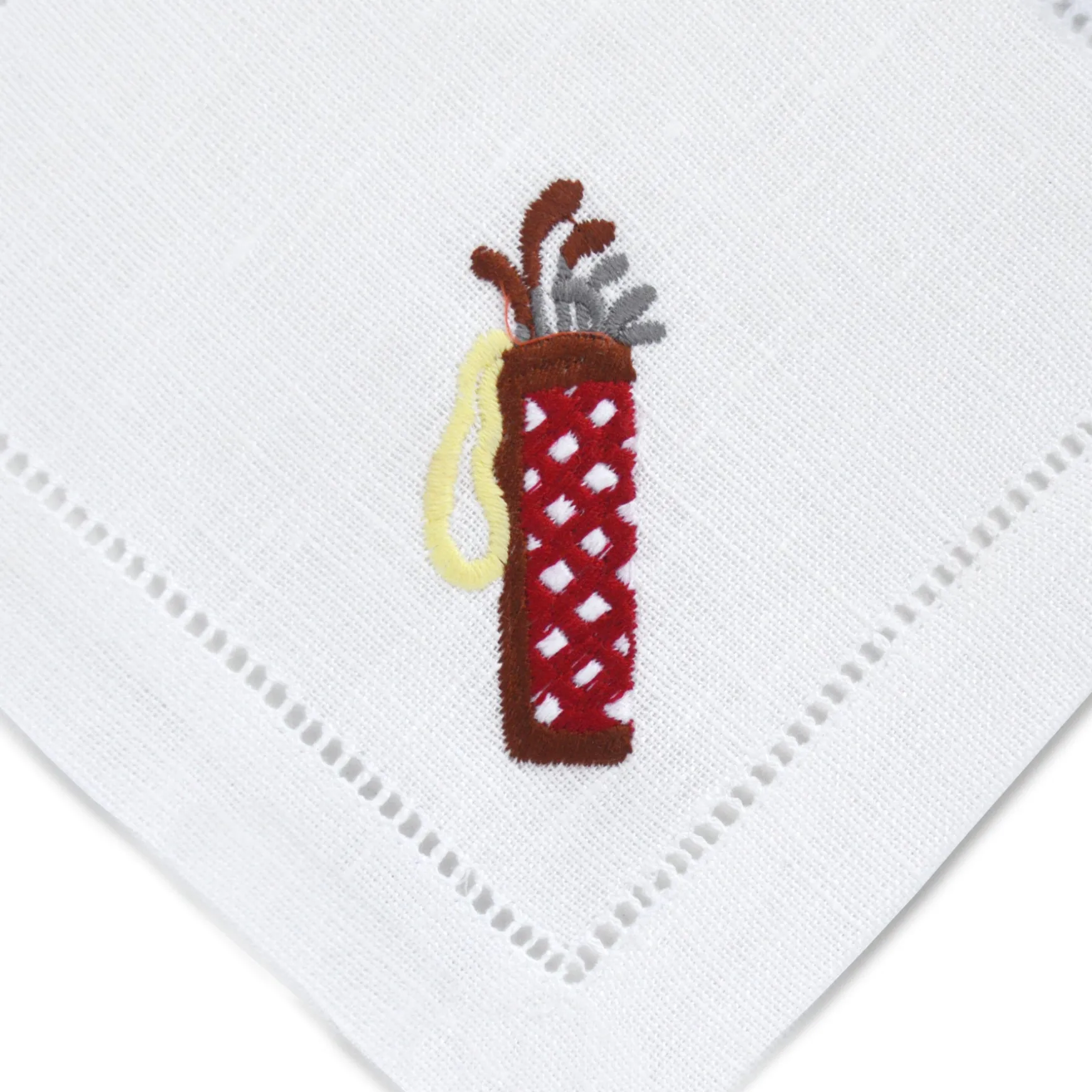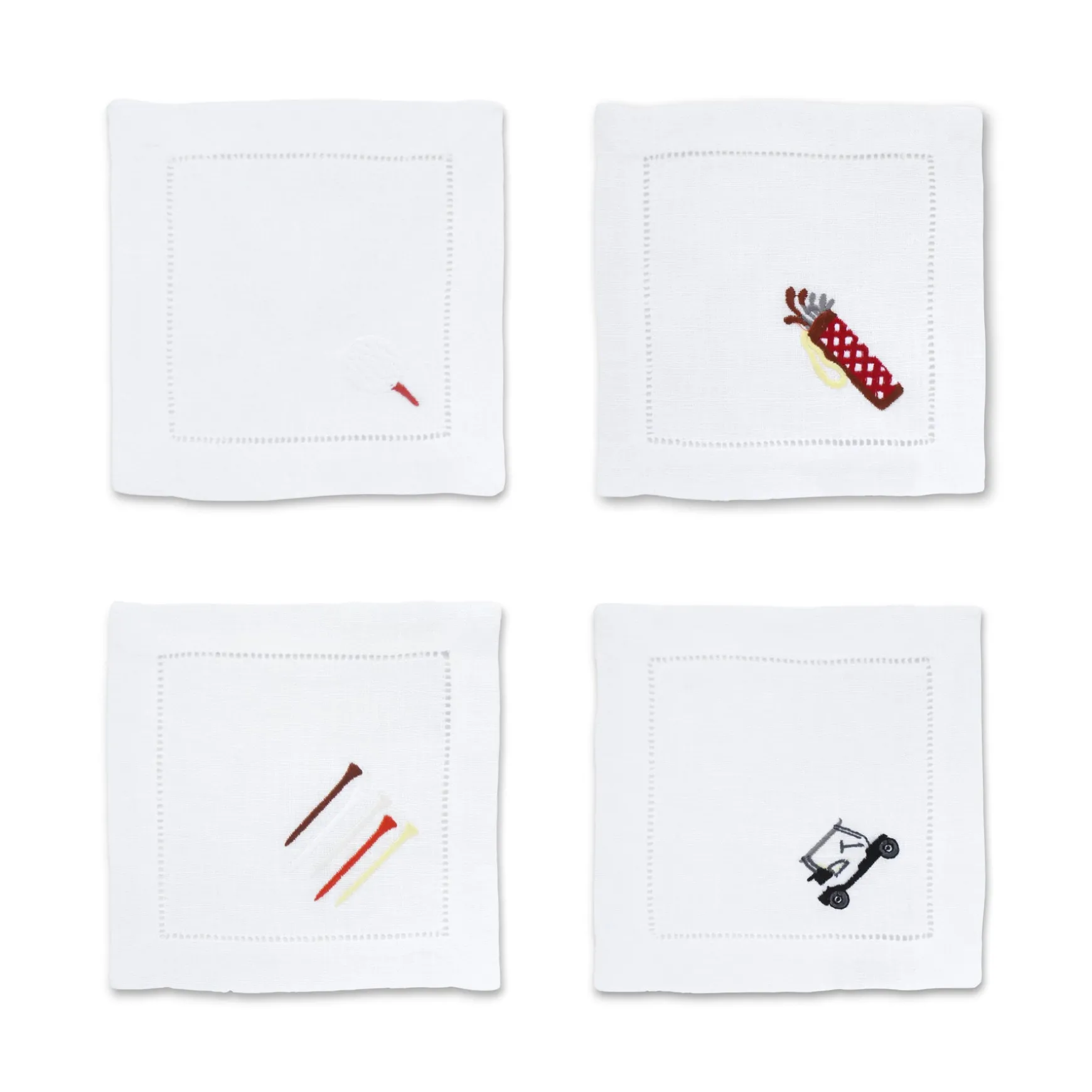Cocktail napkins for golf lovers. Each set has 4 unique embroidered motifs: tees, golf ball, golf cart, and golf bag.