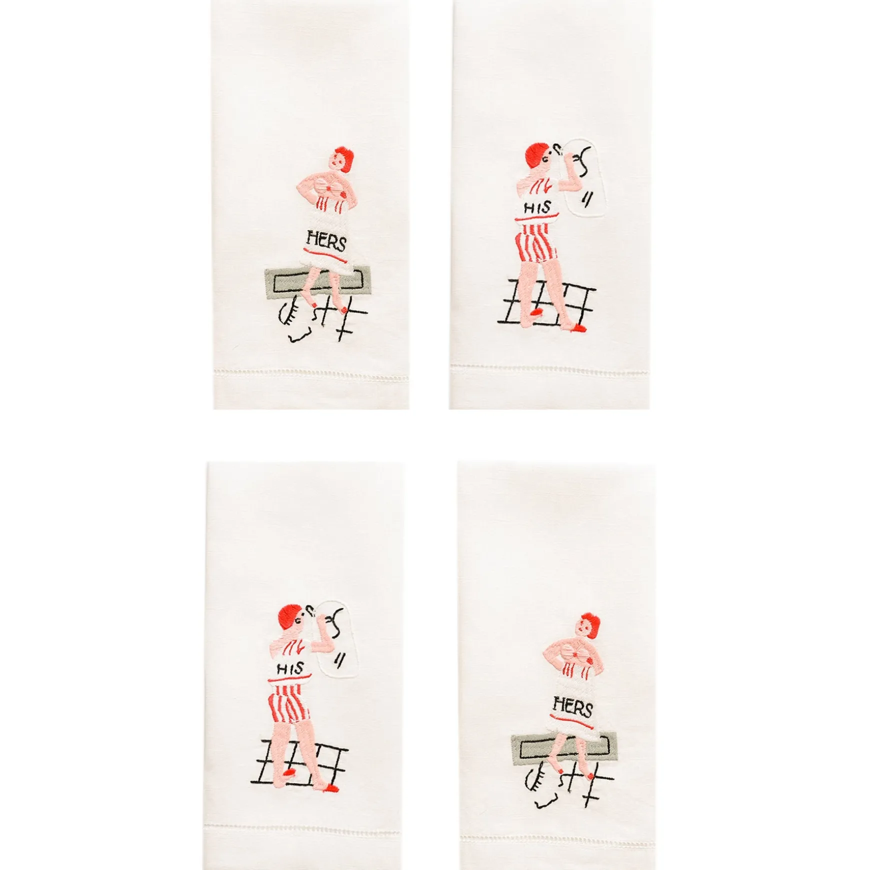 His & hers hand towels inspired by a vintage Madeira design. Because everyone deserves fine linens after they wash their hands.