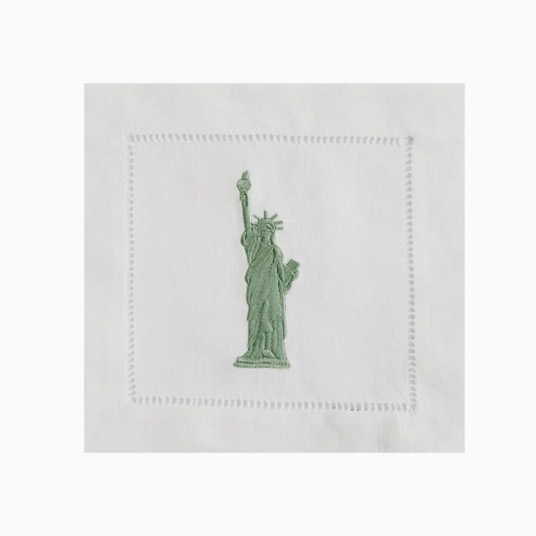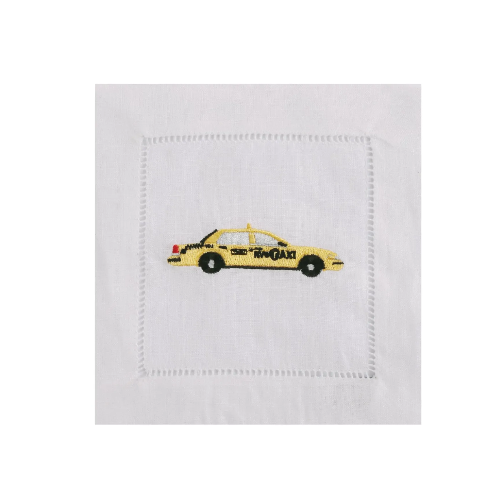 A perfect napkin set for a New Yorker or wannabe! There’s a napkin embroidered for the iconic slice of pizza, filthy pigeon, yellow cab, and Lady Liberty.