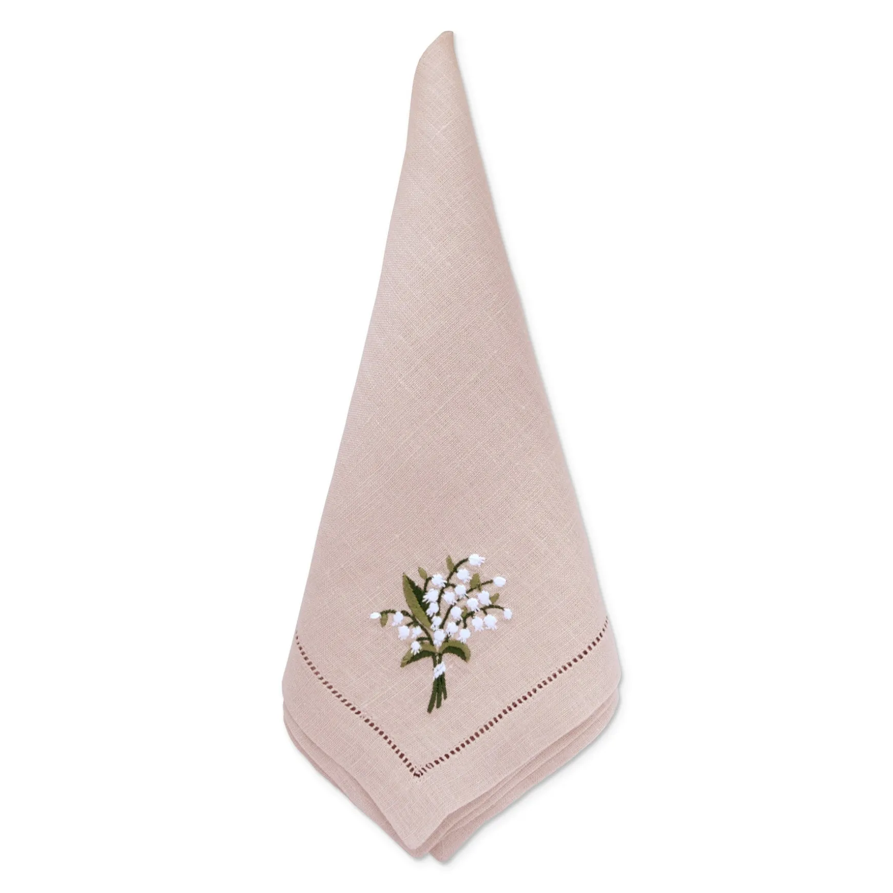 Spring’s most fleeting flower is now permanently embroidered on these dinner napkins. The lily of the valley motif is perfect for spring entertaining: for Easter, Passover, or other occasions.
