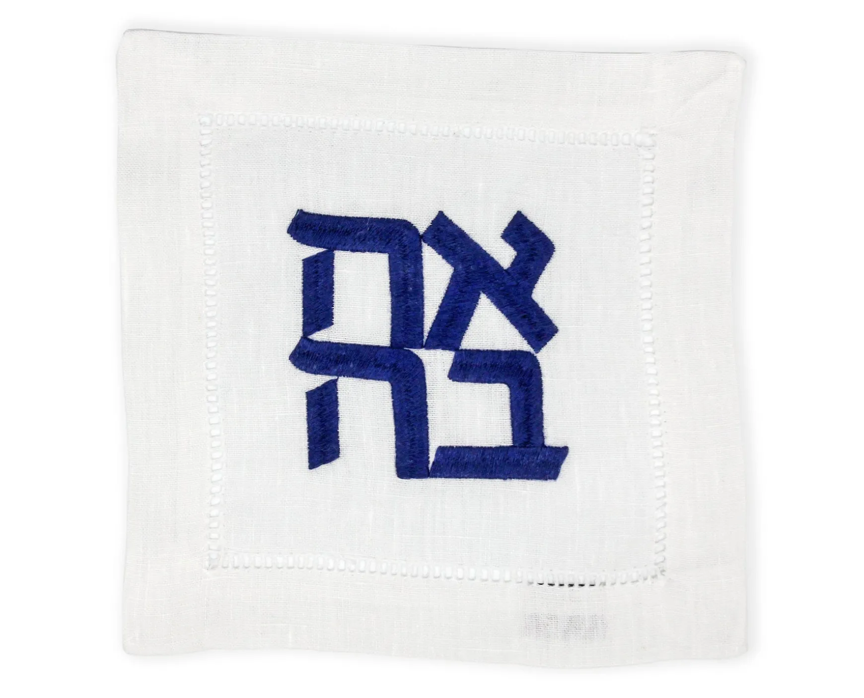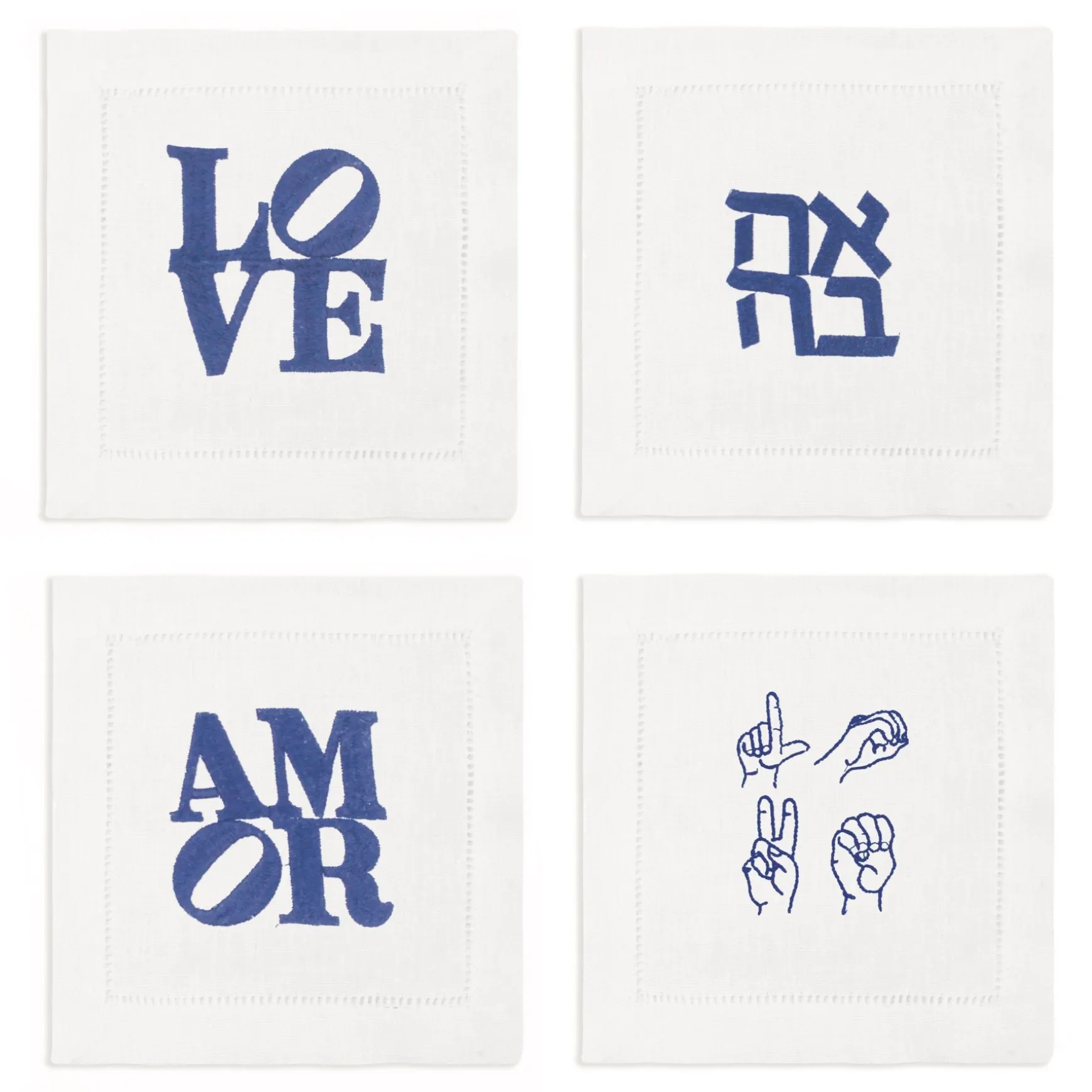 Inspired by the iconic LOVE sculptures, our LOVE cocktail napkins are perfect to say the most important word in English, Spanish, Hebrew, and sign language. The lines of the text are embroidered with navy blue thread. Sold as a set of four.