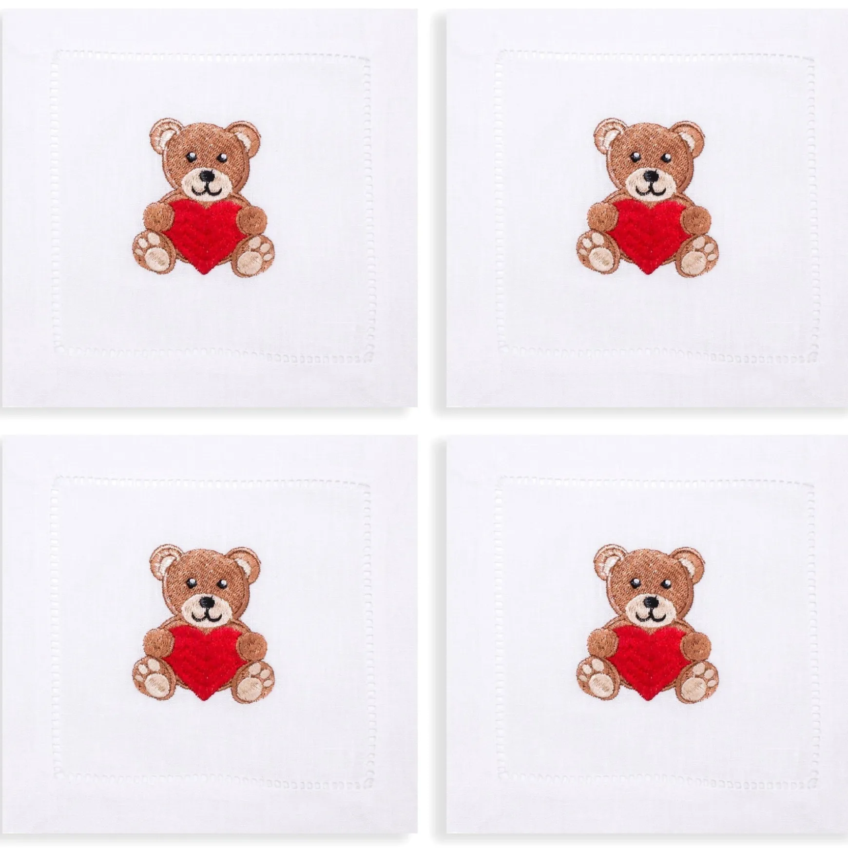 — Embroidered on white linen with hemstitch border.