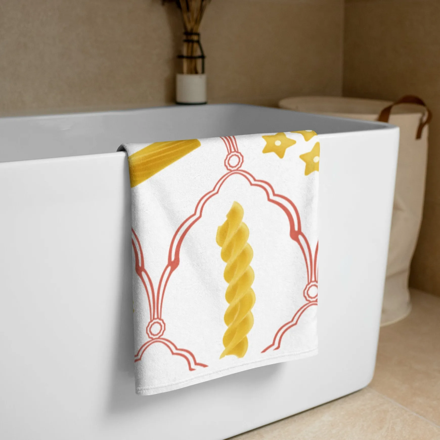 Give your bathroom, beach, or pool a delicious touch and wrap yourself up with this super soft and pasta-printed towel.