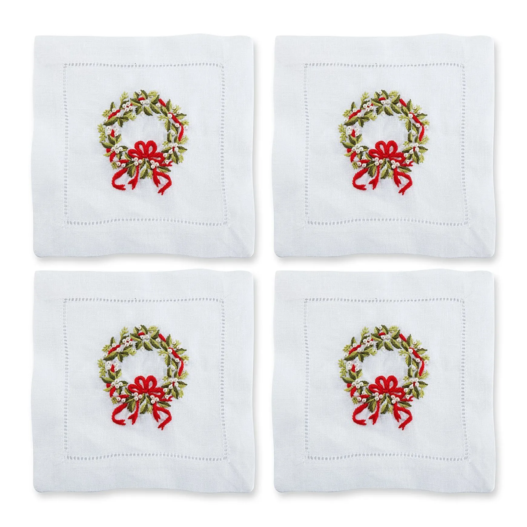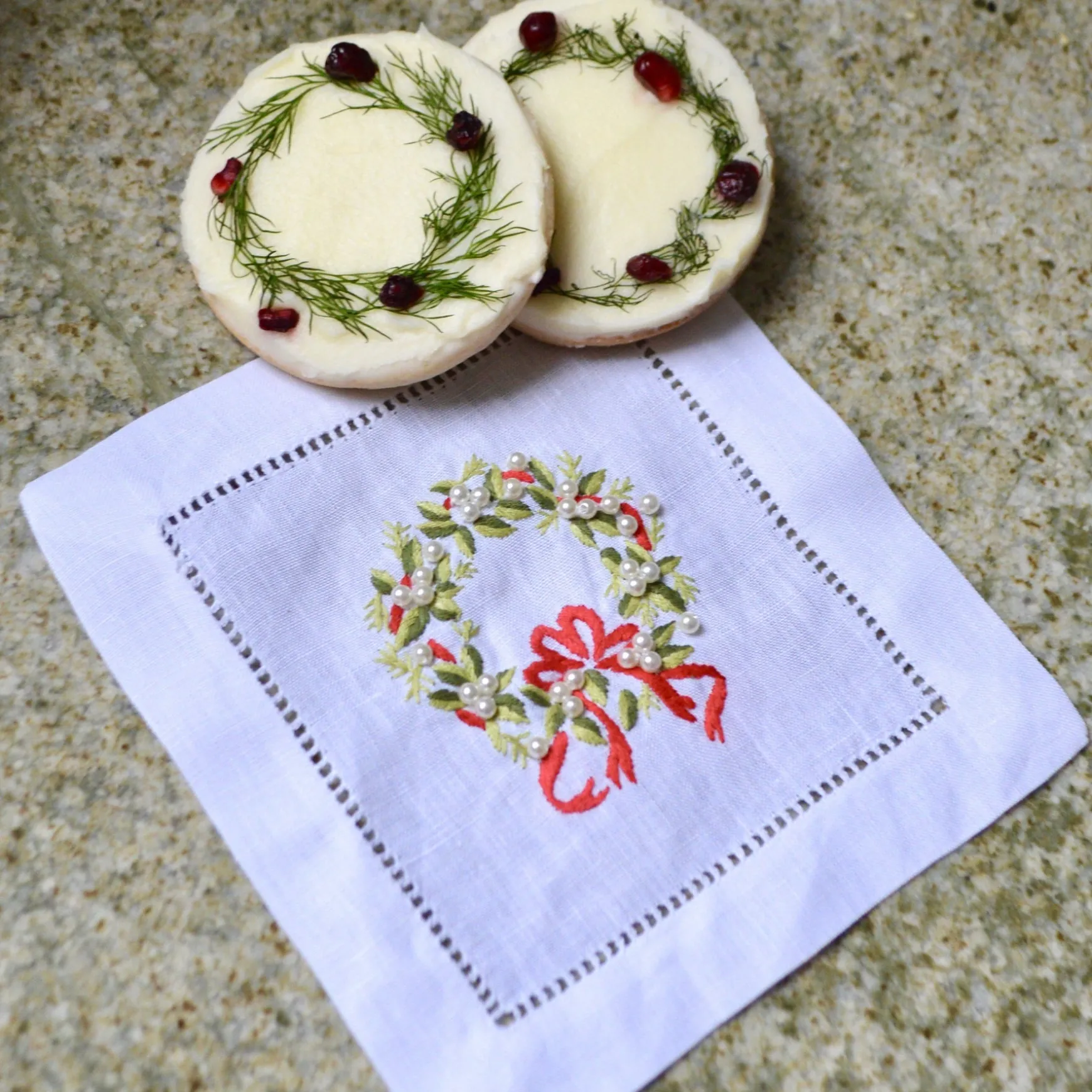 ‘Tis the season for decadence and cocktails! By hand, we’ve embroidered natural pearls into a festive wreath on linen cocktail napkins. It’s the ultimate gift for the host who has everything.