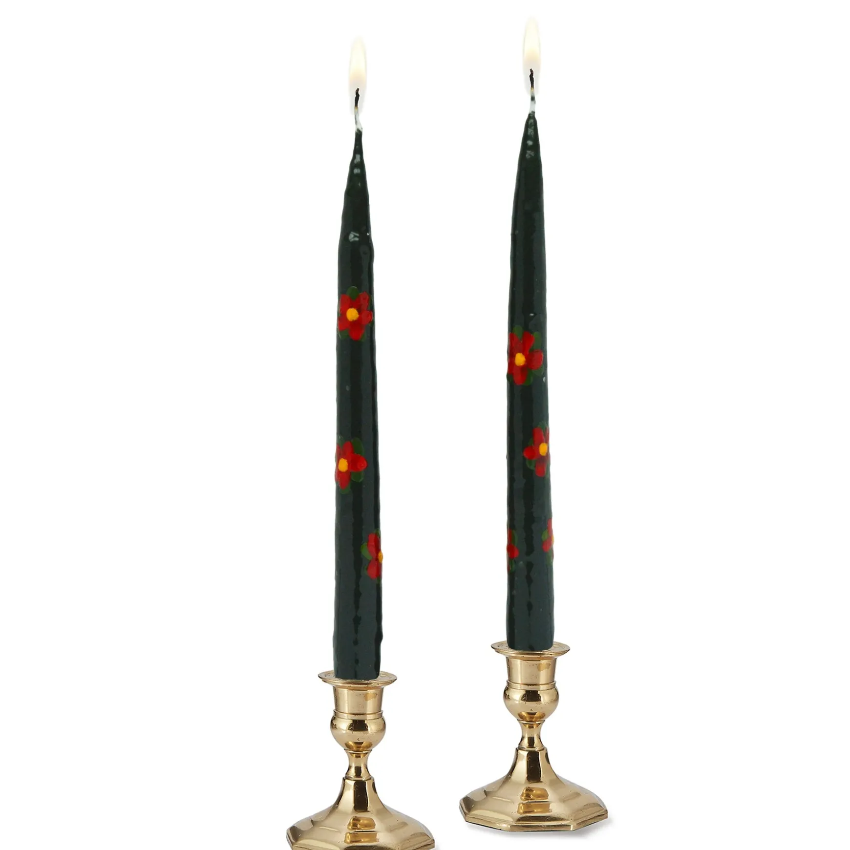 This set of 2 unscented taper candles is painted by hand. The motif is red poinsettias on a dark green candle.