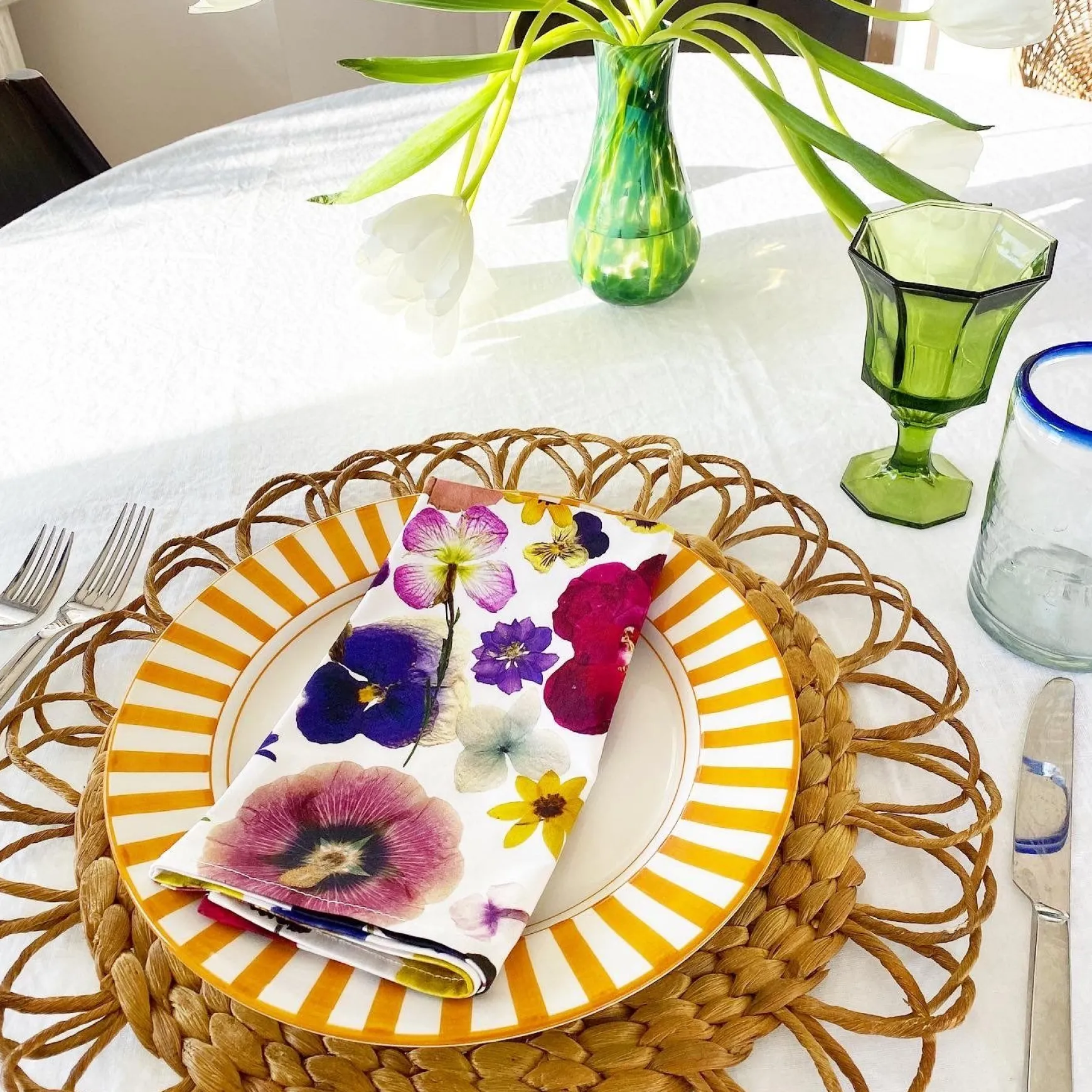 This set of 4 pressed flower square napkins are 18 inches x 18 inches.