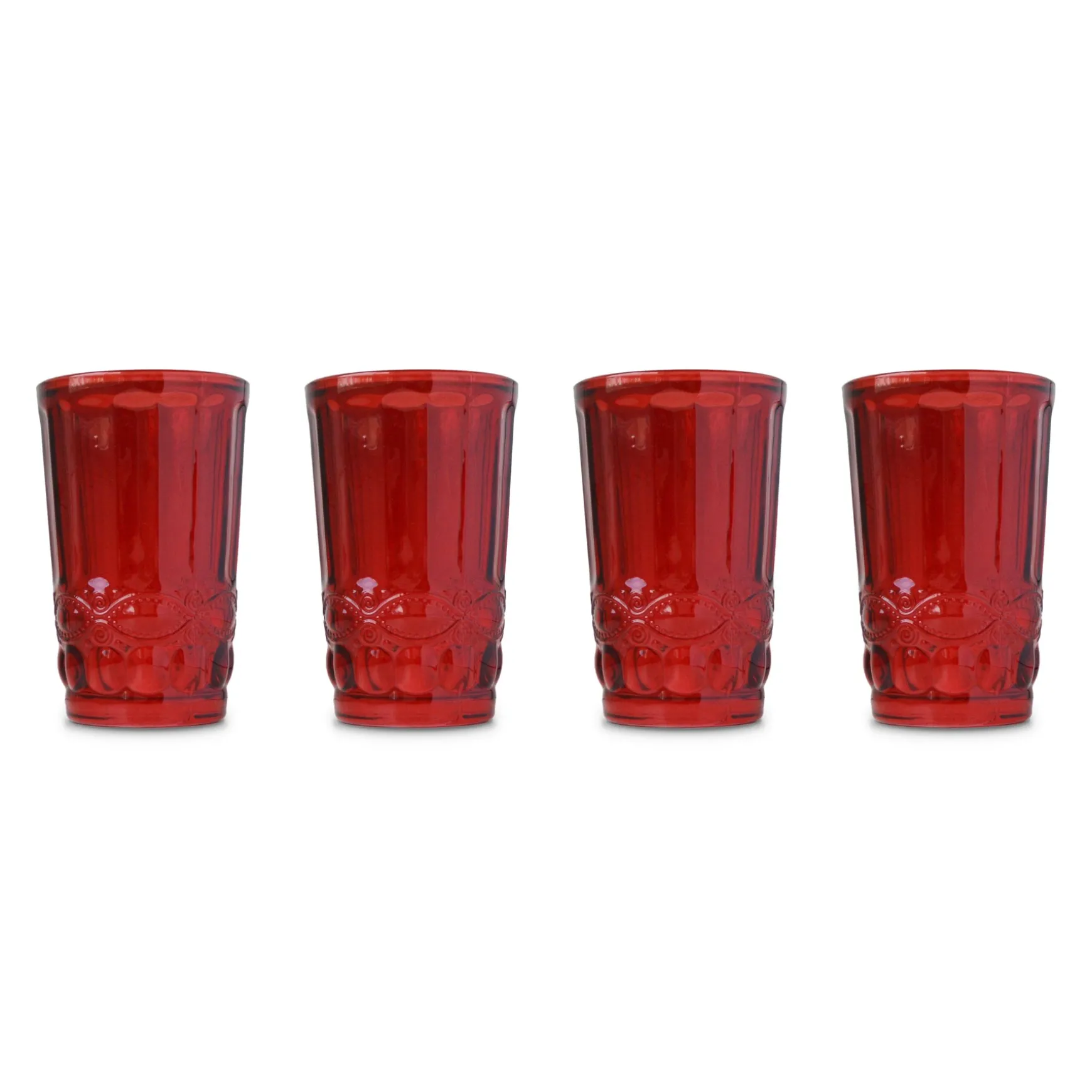 This set of 4 red drinking glasses is pressed with a decorative floral motif.
