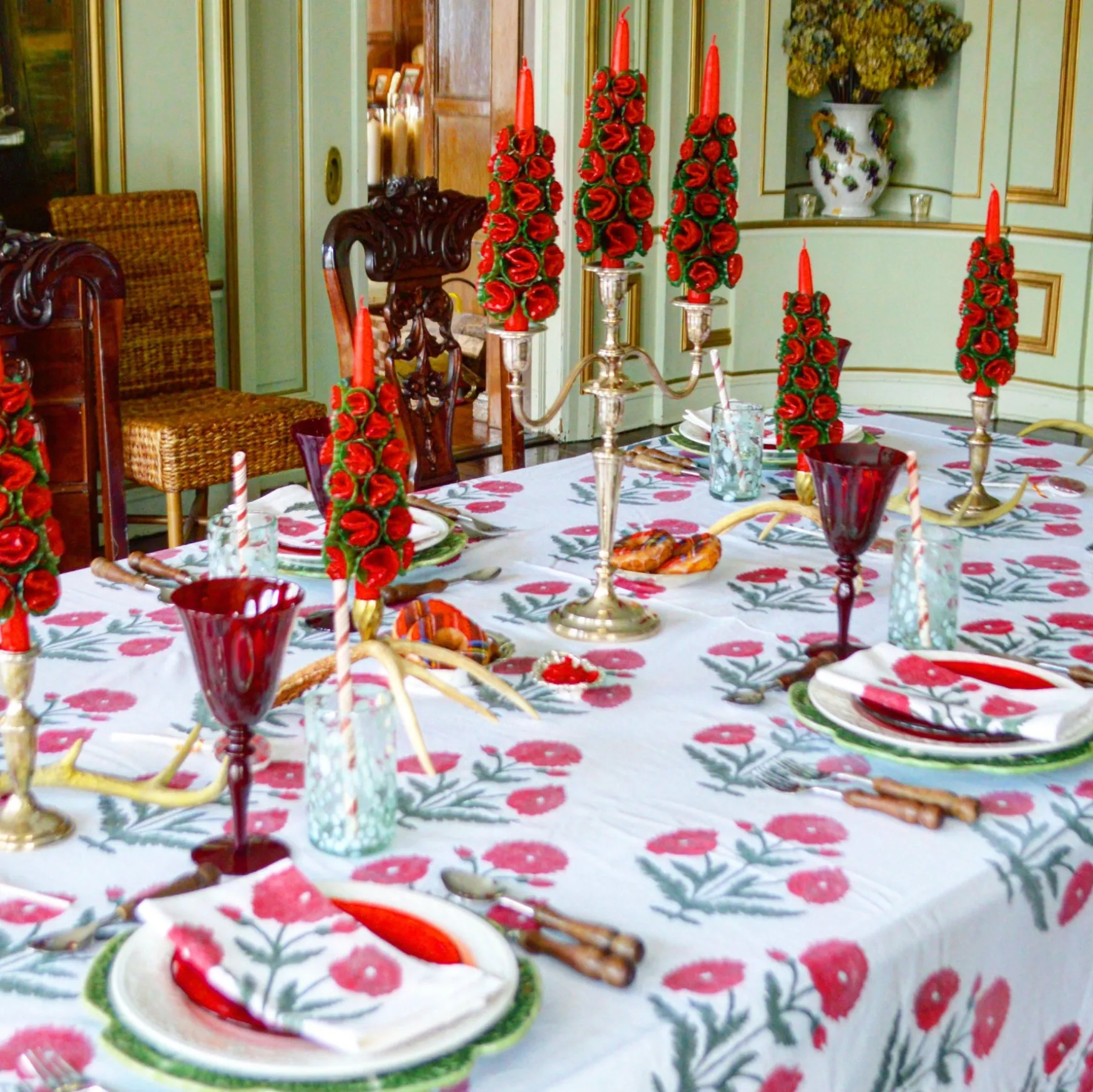 This red poppy block-printed, rectangular tablecloth is available in 2 sizes.