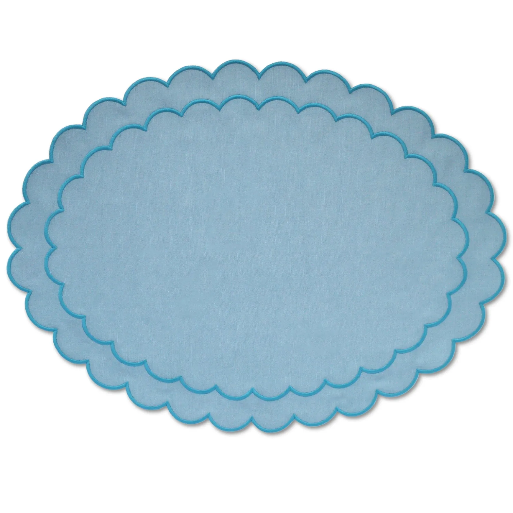 These teal placemats feature an embroidered border with a deeper colored thread on a scalloped edge.