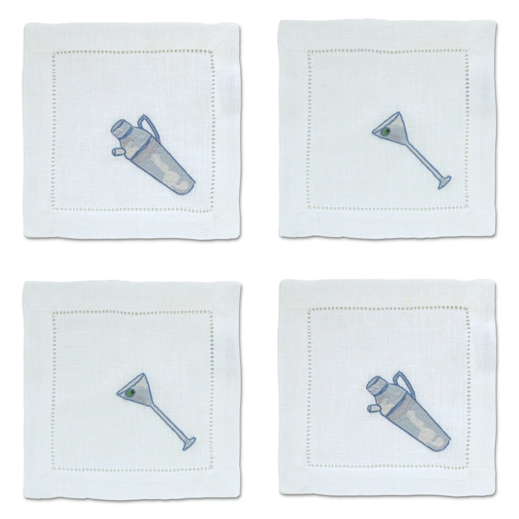 Cocktail napkins for martini lovers. Each set has 2 cocktail napkins with martini embroideries and 2 cocktail napkins with shaker embroideries.