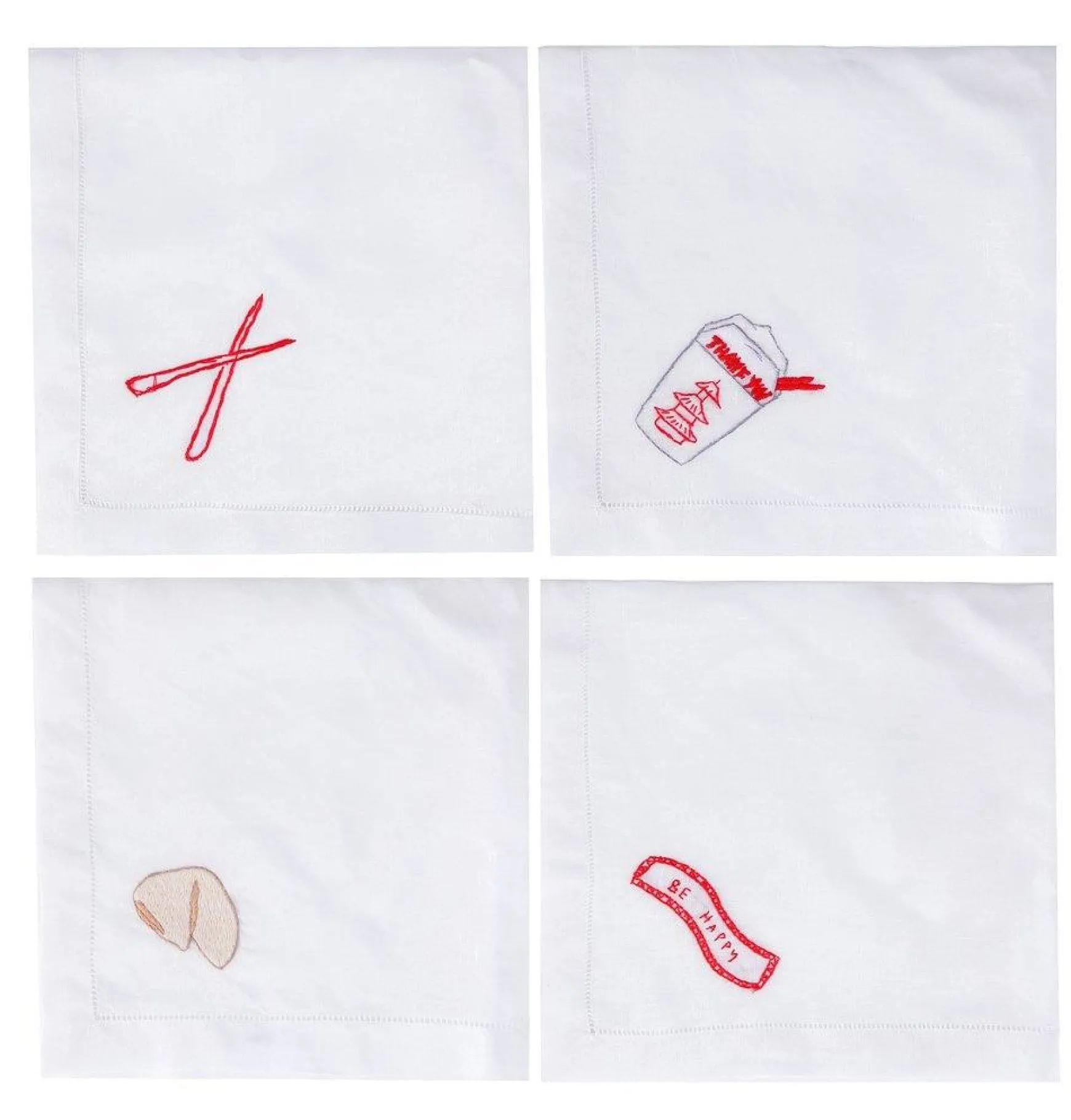 A perfect napkin set to elevate your Sunday Takeout Dinner! There’s a napkin for the iconic takeout container, chopsticks, fortune cookie, and the imperative fortune, “Be Happy”!