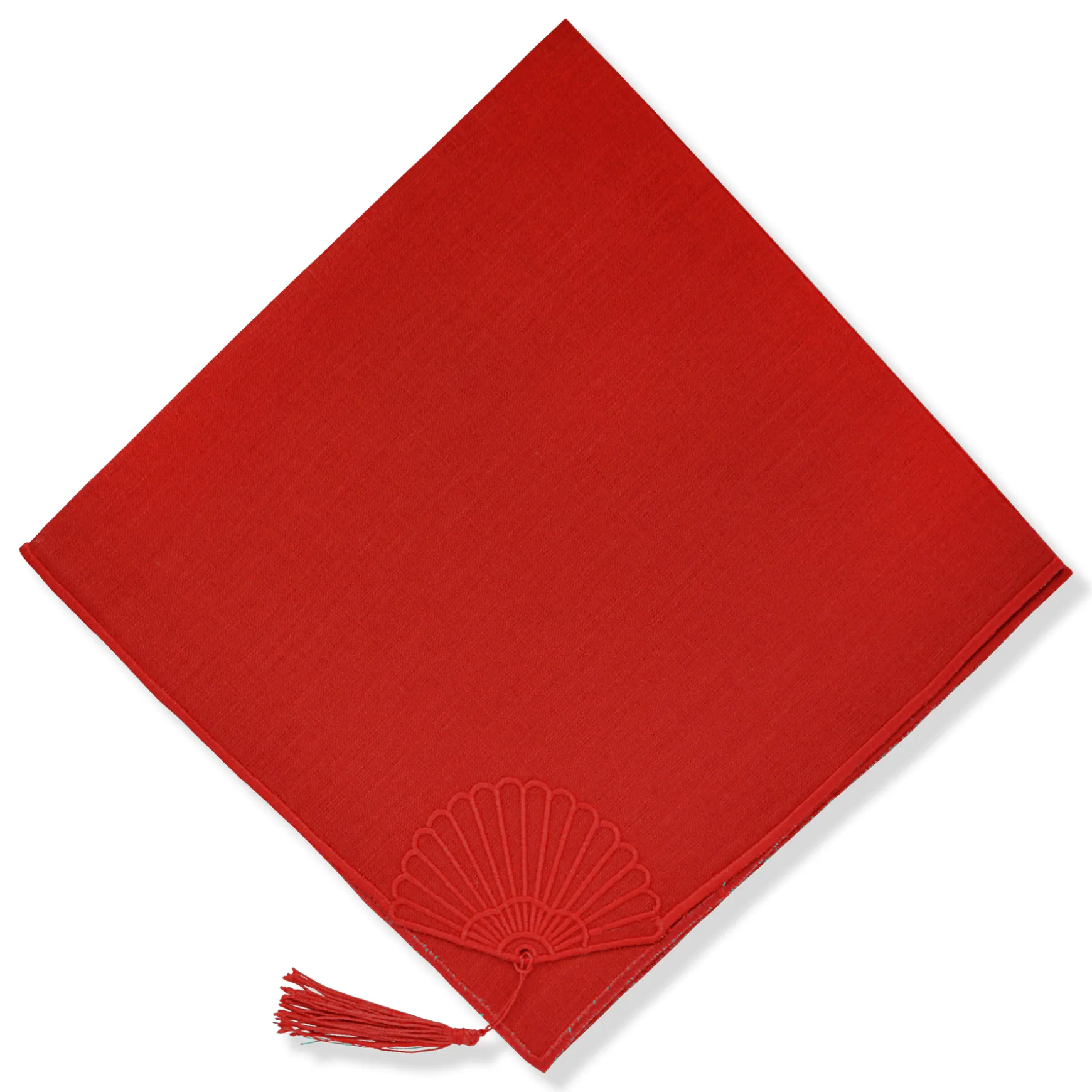 These red linen napkins fold to reveal a fan shape with dangling tassel.