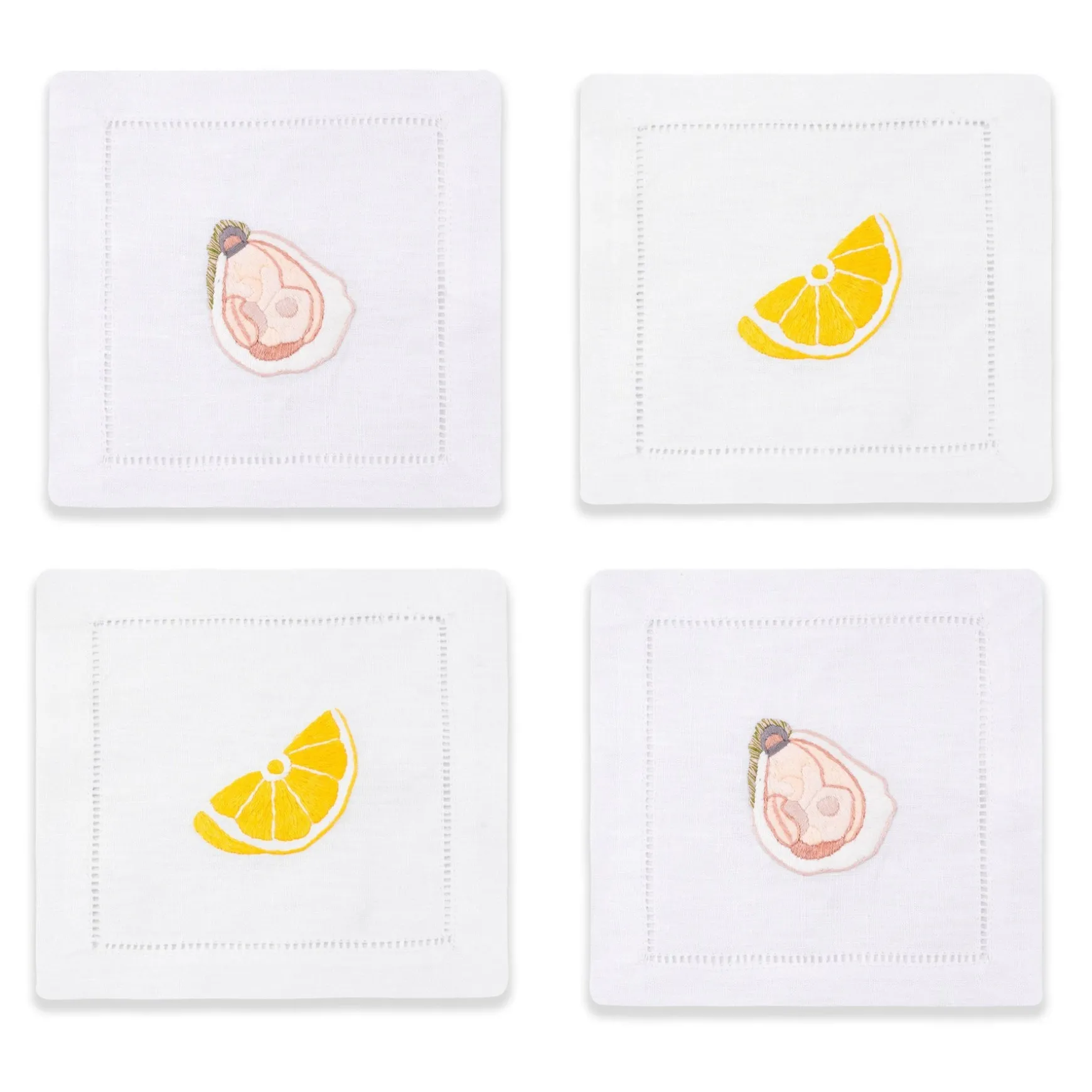 When you’re squeezing a lemon over a fresh shucked oyster, there’s little to want for … except a cocktail napkin to match the experience. In each set of four cocktail napkins, there comes two embroidered lemon wedges and two open oysters.